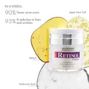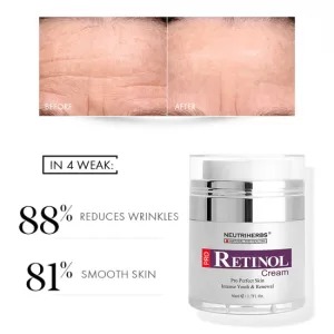 Neutriherbs Retinol Cream delivers the highest concentration of Retinol (Vitamin A) deep into the skin’s surface quickly and effectively. The retinol cream helps to diminish fine lines, and wrinkles, and minimize premature aging due to sun exposure. The Retinol cream also supports natural collagen production and faster cell turnover which leaves your skin visibly smoother and younger-looking.